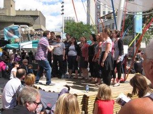 On Sunday during a rare moment of sunshine, The Pop Up Choir performed for a 20 minute set on the band stand in Market Square behind the Royal Festival Hall. We were all really happy with the performance, and we cut through the hangovers and performed:
